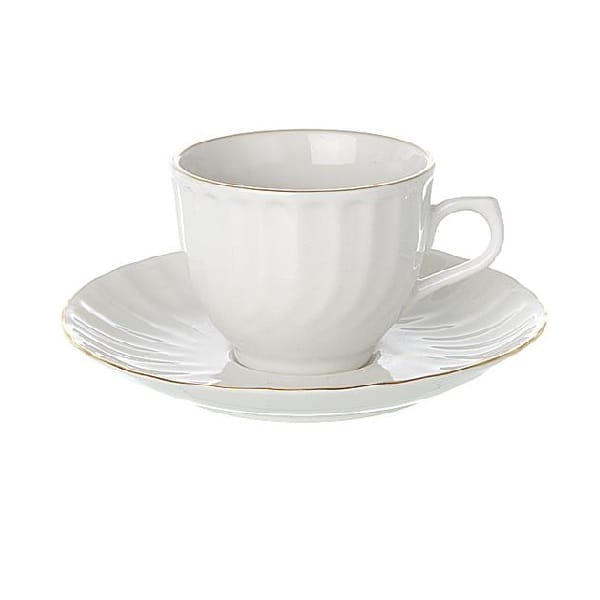 The Gold Line china coffee saucer espresso is essential when hiring our Gold Line espresso cups. Each circular saucer is white china with a fluted edge and a gold rim.